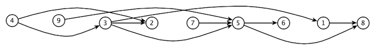 Choisissons de commencer par la 4. On libère alors les contraintes 4->2 et 4->3, et les arcs correspondants disparaissent. Du coup, les tâches pouvant suivre 4 sont à la fois 7 et 9, mais aussi la 3, qui n’avait pas d’autre impératif pour être réalisable que l’exécution de la tâche 4 (dans le graphe obtenu par la suppression de 4, la tâche 3 se retrouve sans arc entrant). Il est alors possible de continuer ainsi jusqu’à ce que toutes les tâches aient été traitées. L’algorithme suivant, décrit de manière simplifiée, reprend ces idées et construit un ordre valide sous la forme d’une liste L des tâches.