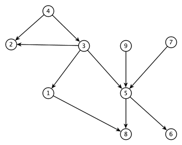 1->8, 3->1, 3->2, 3->5, 4->2, 4->3, 5->6, 5->8, 7->5, 9->5.