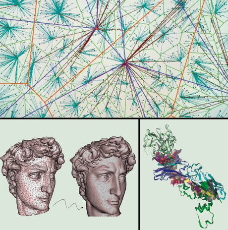 L’image du haut est une représentation de grands réseaux de communication. Cette représentation plane permet de simuler les performances d’un réseau avant sa construction et d’optimiser sa conception. En-dessous, à droite, se trouve une autre modélisation géométrique qui, elle, simule les contacts entre deux protéines en présence d’un virus. Elle permet de comprendre les relations entre l’architecture biologique et la fonction correspondante. Enfin, la représentation de la statue en trois dimensions résulte d’un calcul qui permet de manipuler, stocker et transmettre les données concernant la surface d’un objet réel.